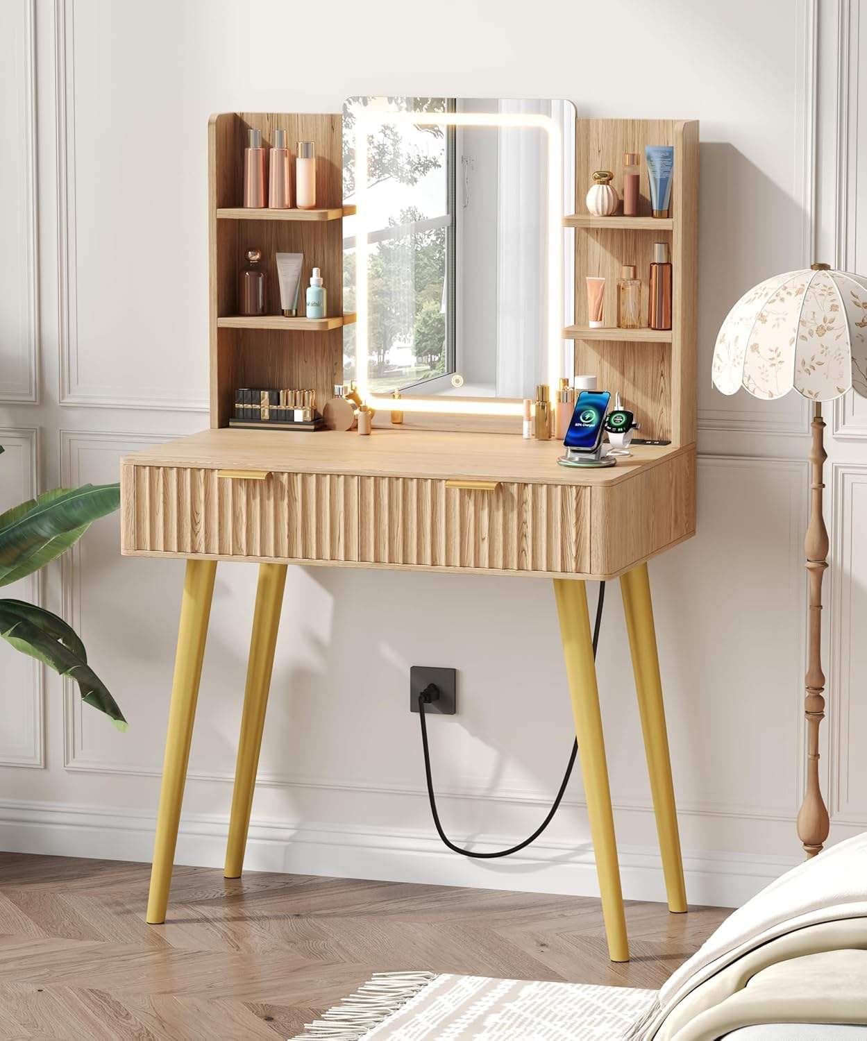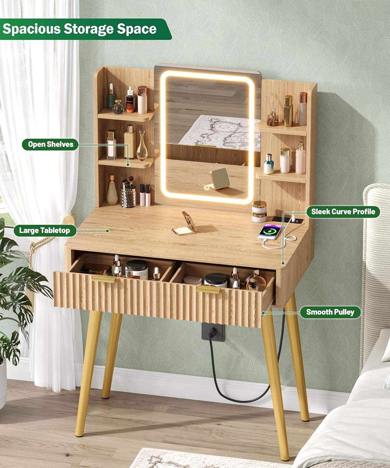 Storage Panel Vanity Desk Mirror LED Makeup 2 Drawers 3 Light Modes Dressing Table