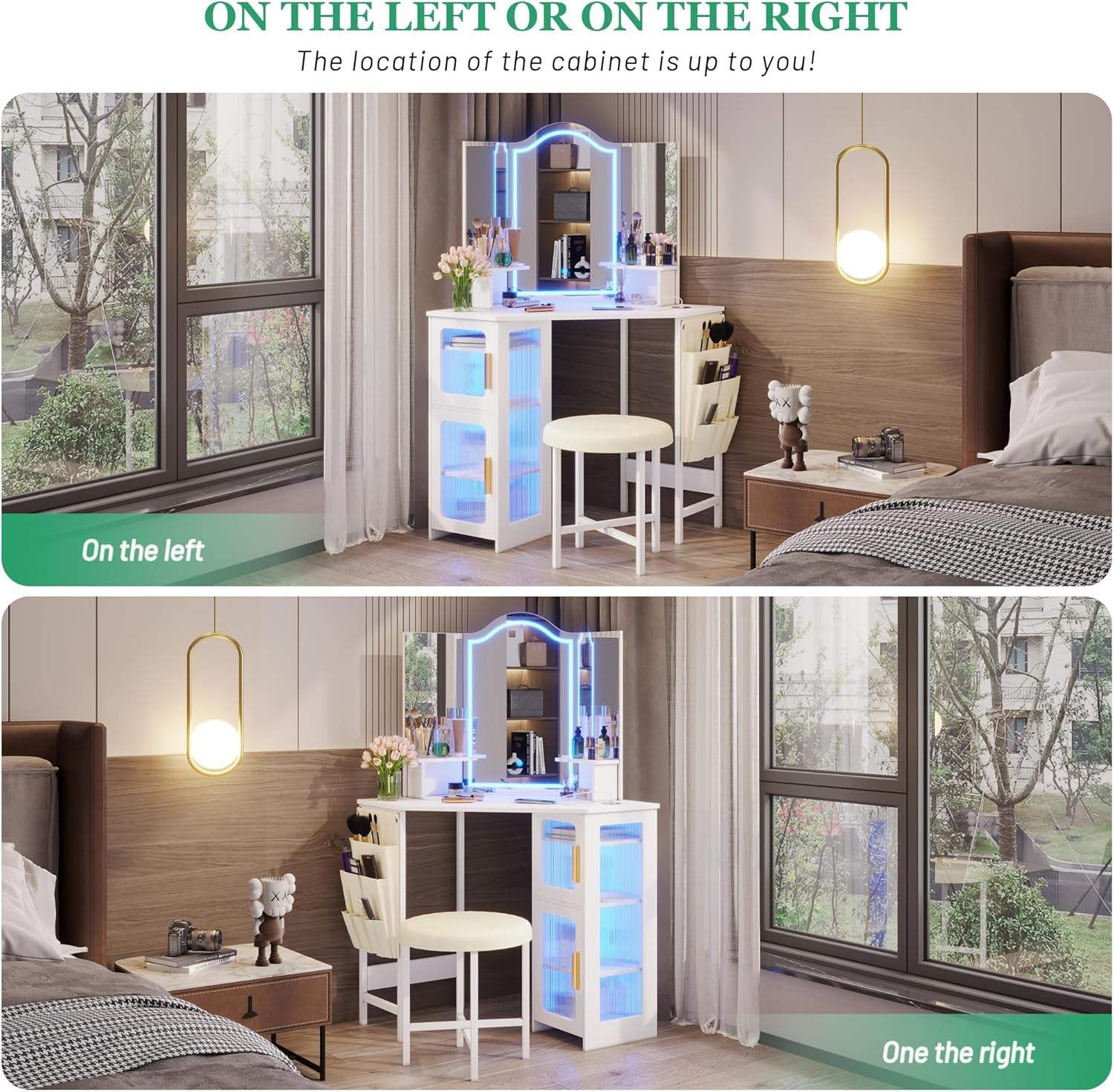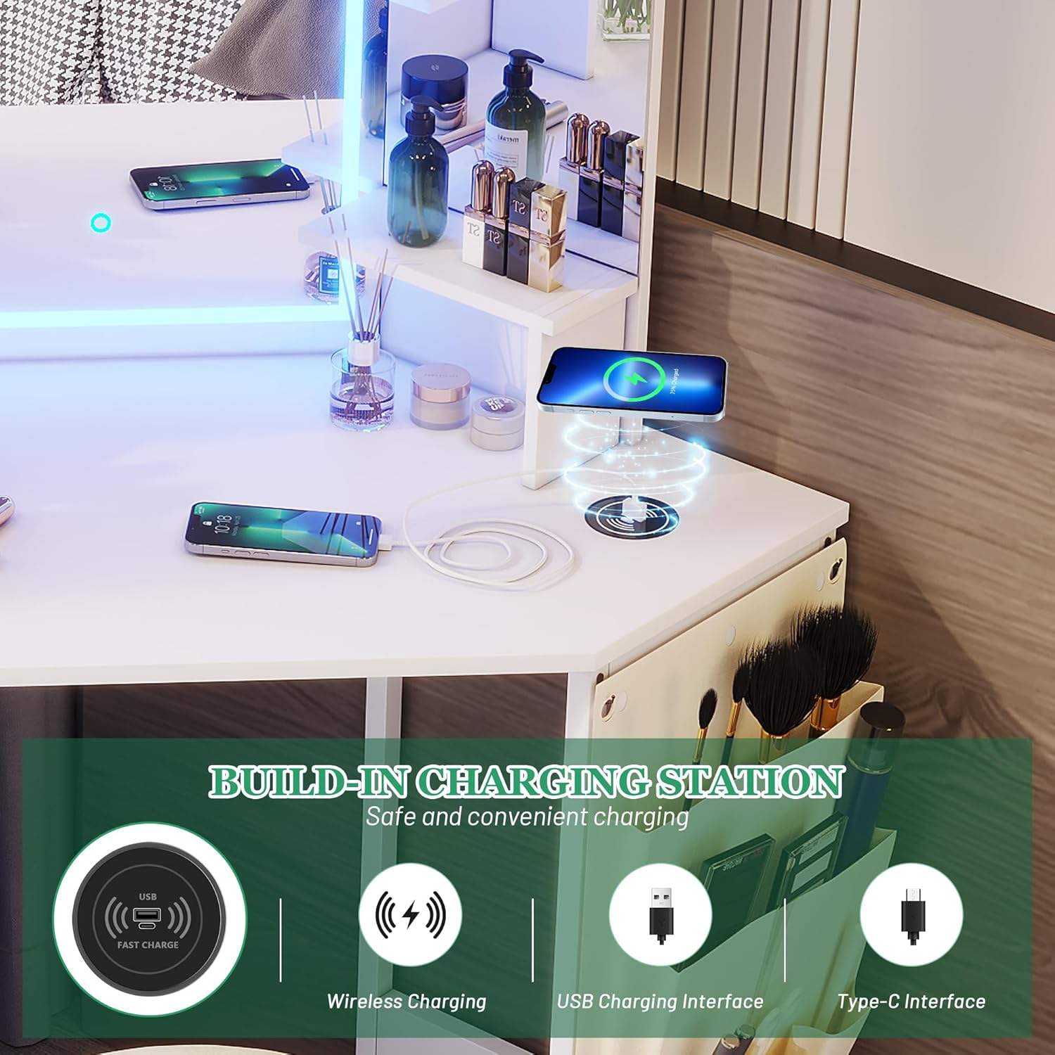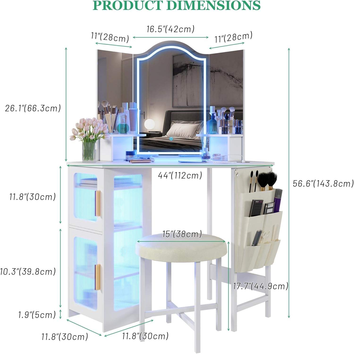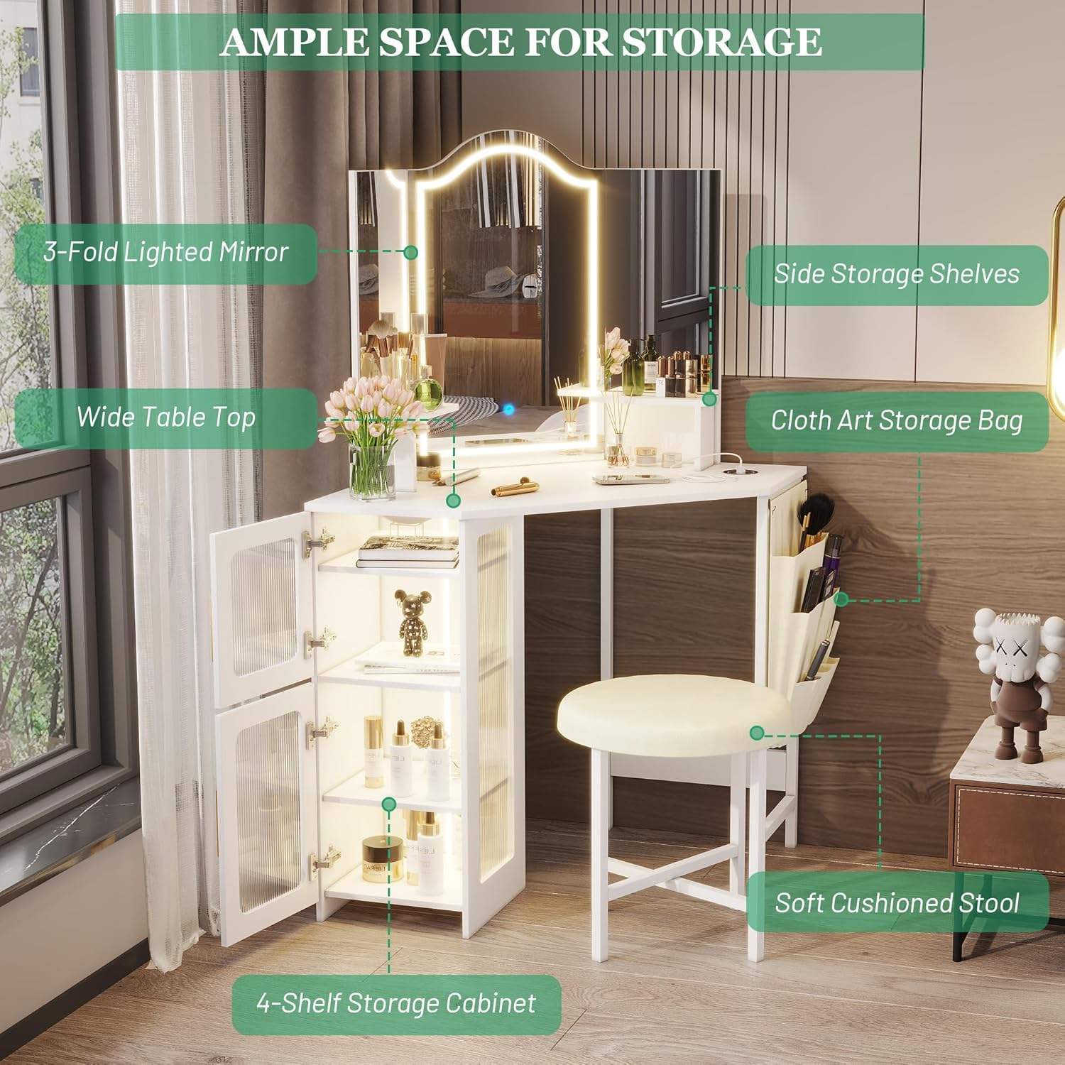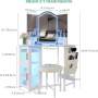 Feature: mirror, lights, charging station, stool, storage cabinet, Adjustable,